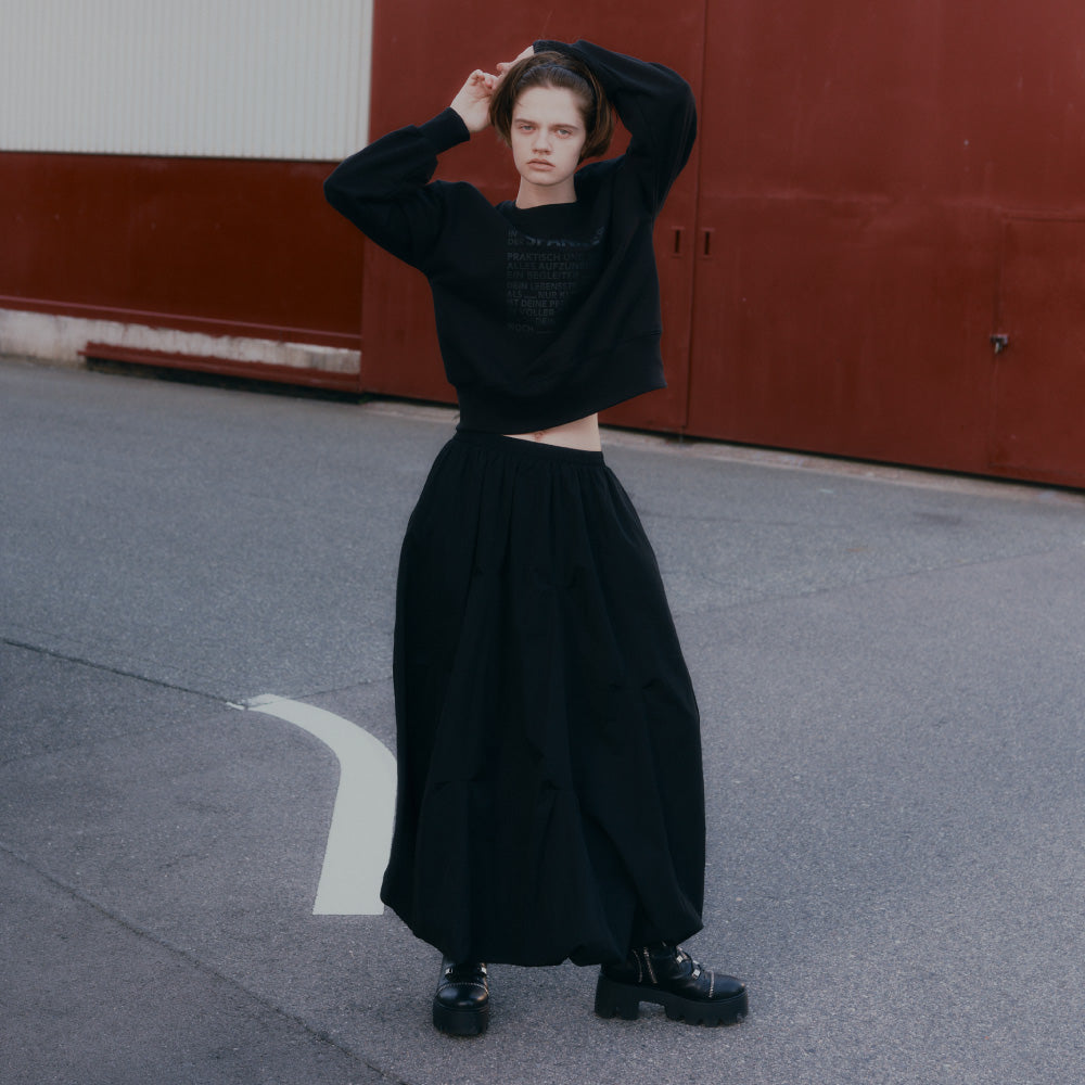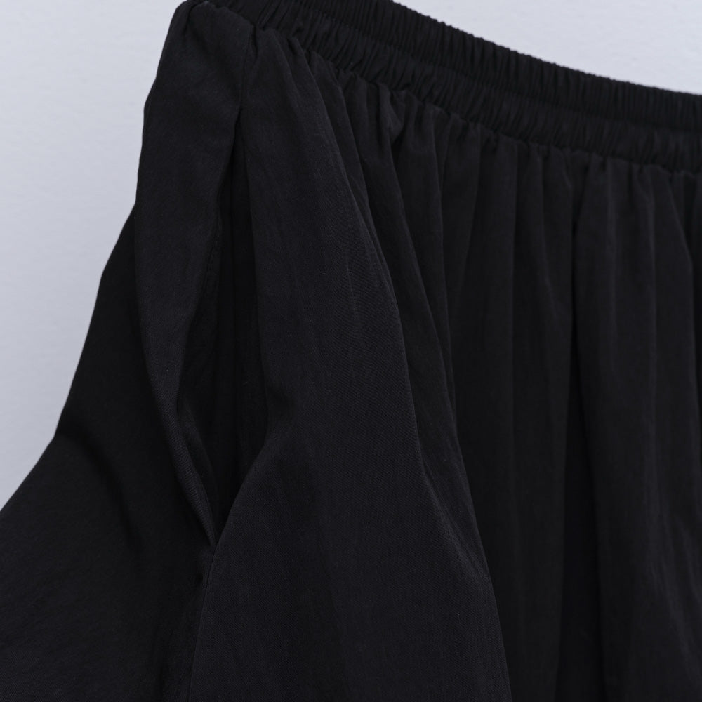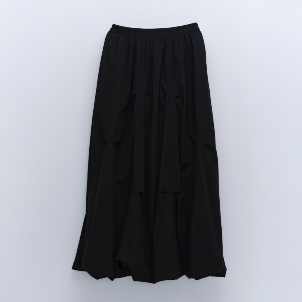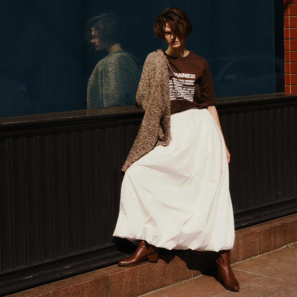 シャリ感のあるさらりとした素材のバルーンスカートは、ところどころ縫い目でつまみ、ふんわりとボリュームのある構築的なシルエットに。